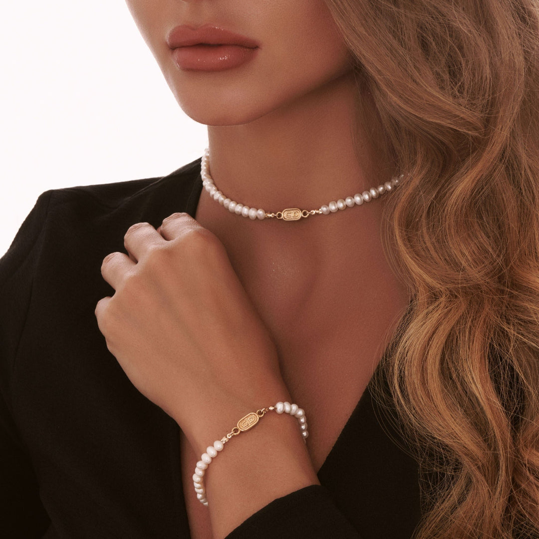 Gold Oval Printed Necklace with Pearl Drop